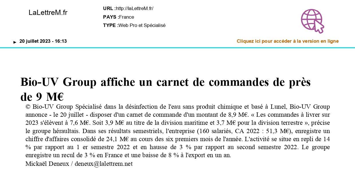 21 juillet 2023 BIO-UV Group affiche un carnet de commandes de près de 9M€ Partager Lire l’article de La Lettre M