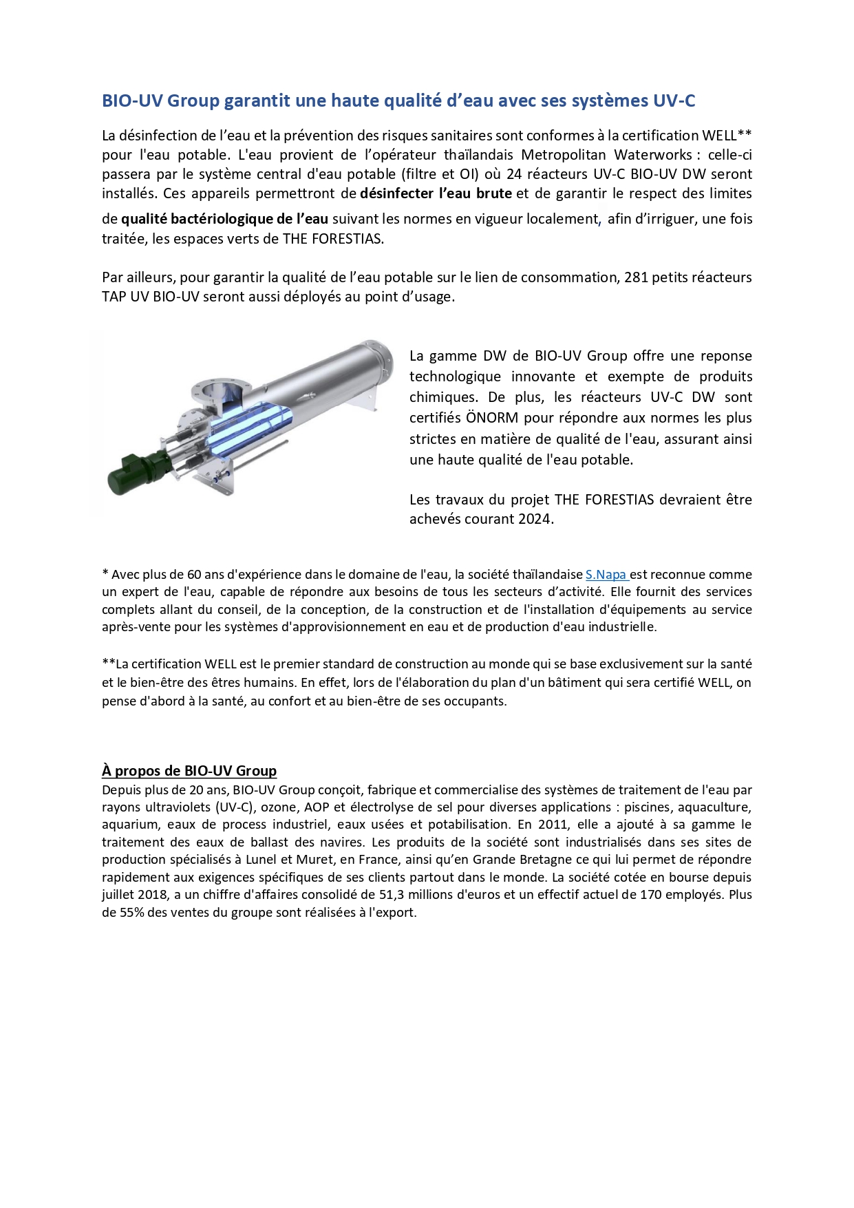 28 septembre 2023 BIO-UV Group engagé dans le projet de ville éco-responsable THE FORESTIAS à Bangkok ! Partager