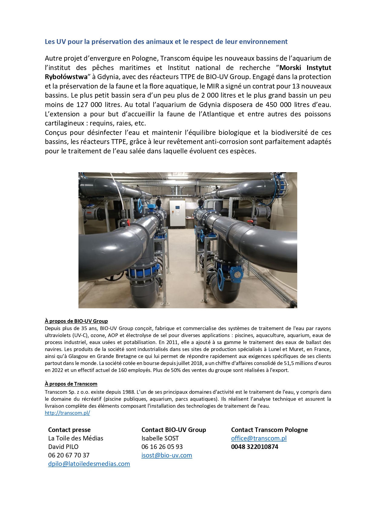 7 mars 2023 BIO-UV Group signe un nouveau partenariat avec l'intégrateur Polonais TRANSCOM pour la piscine publique et les aquariums Partager