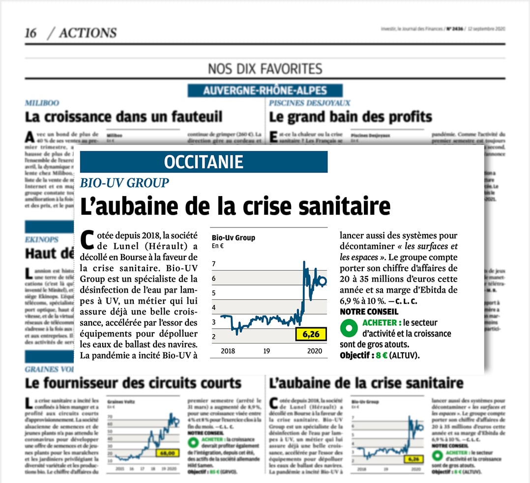 Cotée depuis 2018, la société de Lunel (Hérault) a décollé en Bourse à la faveur de la crise sanitaire. BIO-UV Group est un spécialiste de la désinfection de l’eau par lampes à UV, un métier qui lui assure déjà une belle croissance, accélérée par l’essor des équipements pour dépolluer les eaux de ballast des navires. La pandémie a incité BIO-UV Group à lancer aussi des systèmes pour décontaminer « les surfaces et les espaces ». Le groupe compte porter son chiffre d’affaires de 20 à 35 millions d’euros cette année et sa marge d’Ebitda de 6,9% à 10%.