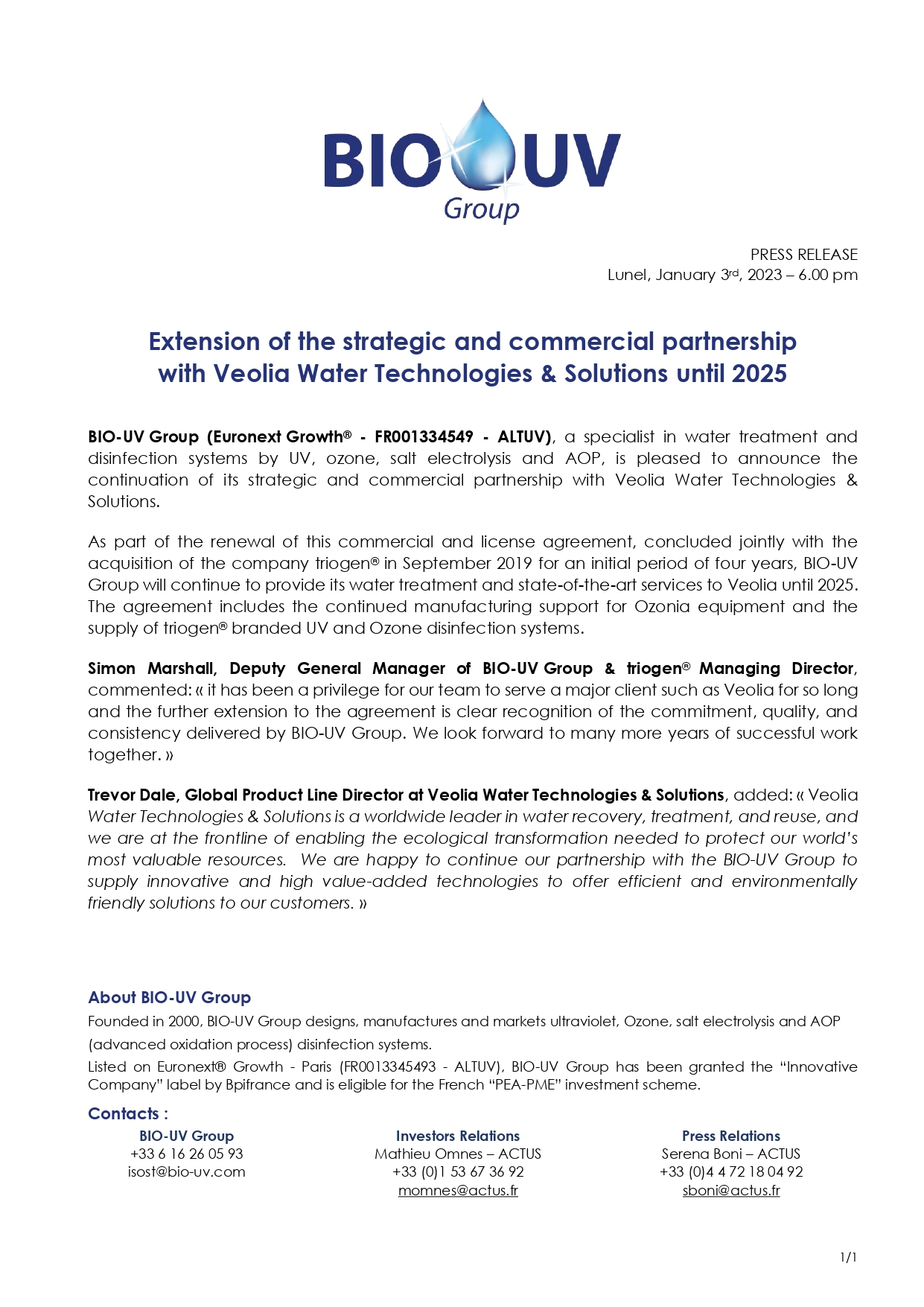 3 January 2023 Extension of the strategic and commercial partnership with Veolia Water Technologies & Solutions until 2025 Share